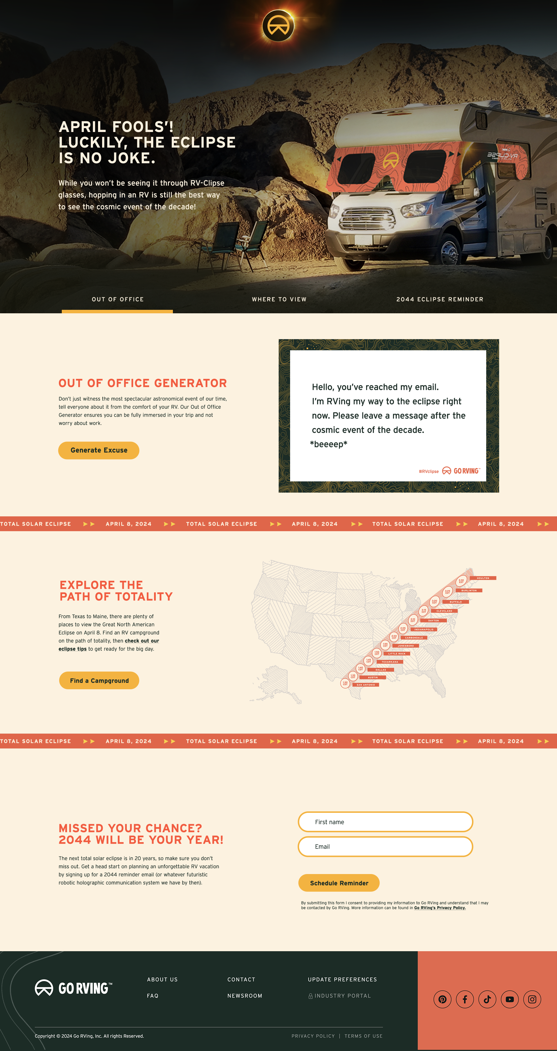 When April Fools’ Day and a super rare solar eclipse aligned, we knew we had to capitalize on these two cultural events in a surprising way. People would be traveling to see the eclipse, many in their RVs. And with only three weeks and very little budget, and we had just one shot. So we promoted what everyone with an RV needed - GIANT eclipse glasses for their windshield. We made a teaser post to let people know something was coming and launched the reveal on April Fools’ that sent viewers to a website where we revealed the prank. The website also had a map with campsites near that path of totality, a calendar reminder for the next eclipse in 2044 and even OOO messages. The joke landed—with RVers and AdAge alike.
